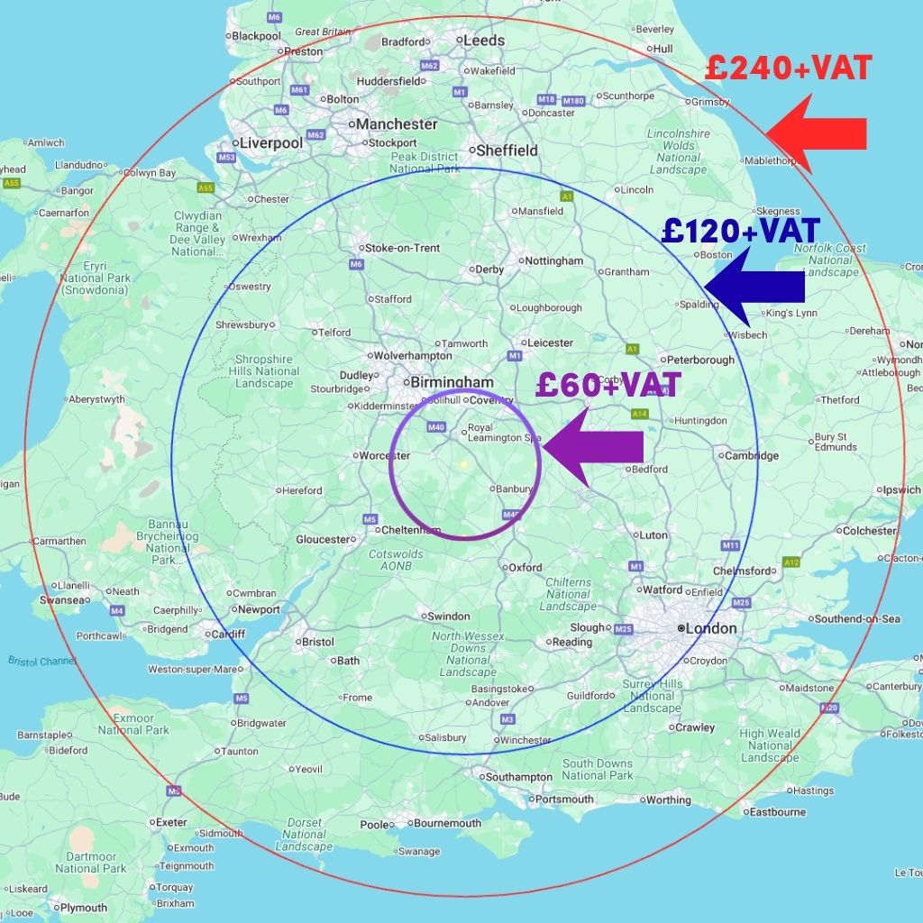 We charge £120 + VAT up to 80 radius miles around our unit (CV35 0HU)
